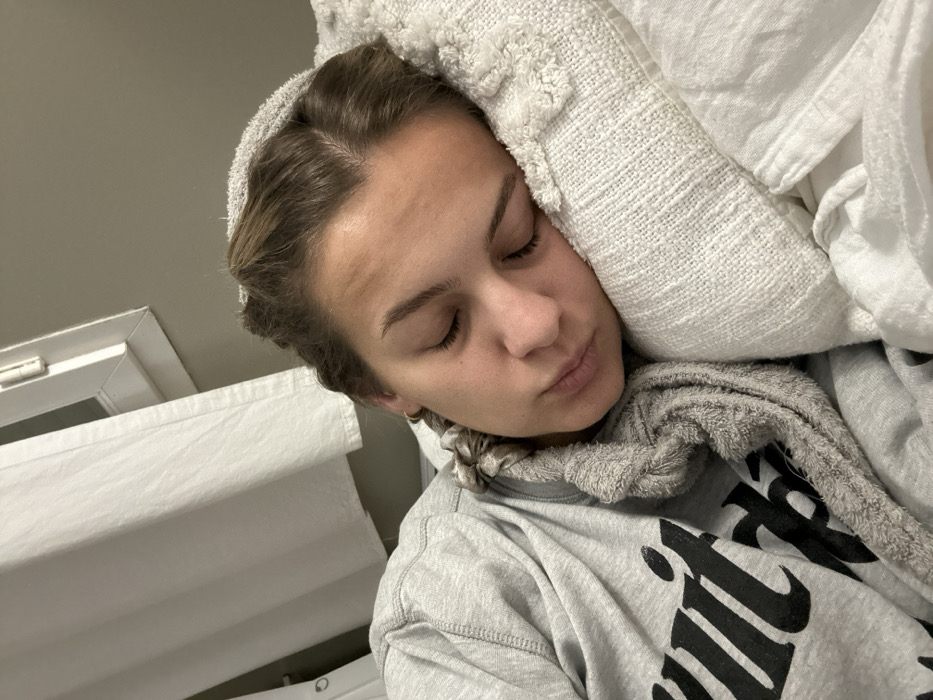 - "A woman sleeps in bed with a towel wrapped around her head, resting against a white pillow" by FM-Mqmx03, licensed under CC BY 4.0