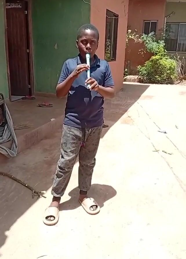 - ". A young boy stands outdoors on a sunny day playing a light-blue recorder. He faces the camera, wearing a dark blue polo shirt, patterned gray pants, and light-colored sandals. He is positioned on a concrete area in front of a building that has a green section with a dark brown door and a light reddish-brown section with windows. A boombox sits next to the green portion of the building. A stick lies on the ground to the left of the boy, and some dried leaves or twigs are scattered around the concrete surface. A small bush is to the right of the boy." by FM-2XEJh2, licensed under CC BY 4.0