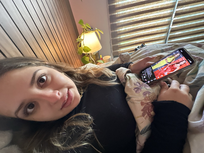 A person lies in bed, holding a smartphone. The phone's screen displays a video featuring two women in brightly colored outfits. The individual is looking at the camera with a slight smile. A lamp with a plant on top stands on a bedside table, and window blinds are visible in the background. The bed is covered with patterned sheets. The person is wearing a black long-sleeved shirt. Wooden slats form a wall behind them.