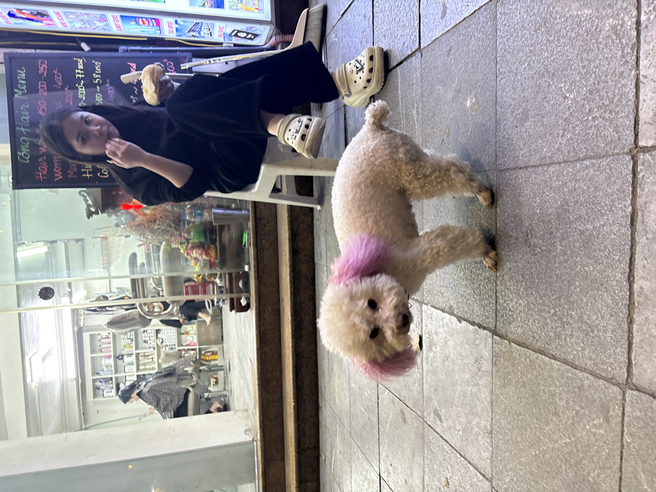 The scene depicts a street-level view in front of a hair salon in Hà Nội, Vietnam. In the foreground, a small, light-colored Poodle or Poodle-type dog with distinctively dyed bright pink ears stands on a grey paved sidewalk, facing slightly left with its head turned towards the viewer. In the midground, a woman with long dark hair, wearing a dark long-sleeved top and dark wide-leg pants, sits on a white plastic stool. Her left leg is crossed over her right, and she wears light-colored platform Crocs adorned with charms. She holds a light-colored bun or pastry in her left hand, which is raised towards her mouth, and looks directly at the viewer. To the right of the woman, a black chalkboard sign displays "Cộng HAIR" at the top, followed by a price list for hair services in both Vietnamese Dong and USD. Adjacent to this sign, a vertical illuminated display board shows various images, potentially for a travel agency. Behind the woman and the signs, a glass storefront reveals the interior of the hair salon, which is elevated by two steps from the sidewalk. Inside, shelves stocked with hair products are visible. Two other individuals are present within the salon: one is seated in a salon chair, wearing a dark cape, and appears to be looking at a phone; another person is partially visible further inside. A small decorative shrine or display with figures is also visible inside near the entrance. A broom leans against the wall near the woman's feet.