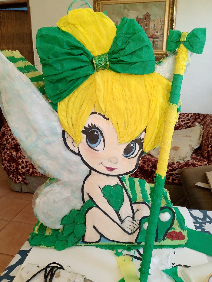 A Tinkerbell piñata is displayed on a table