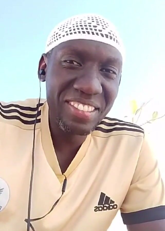 A man with dark skin smiles at the camera. He wears a white knitted cap and a tan-colored Adidas shirt with black stripes on the shoulders. He has earphones in his ears and a microphone clipped to his shirt. A tree with green leaves is slightly blurred in the background, and the sky is a clear blue. The man's teeth are visible as he smiles, and he has a neatly trimmed beard. The light is bright, suggesting it's daytime.