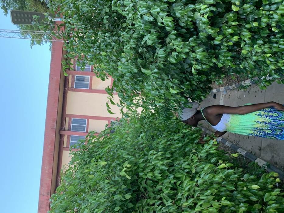 A woman in a bright green and blue patterned dress walks along a paved path lined with lush green hedges. Behind her, a multi-story building with beige walls and red trim is visible. Several windows are evenly spaced on the building's facade. A tall lamp post rises into the blue sky. The vegetation dominates the view, creating a natural screen or border to the scene.