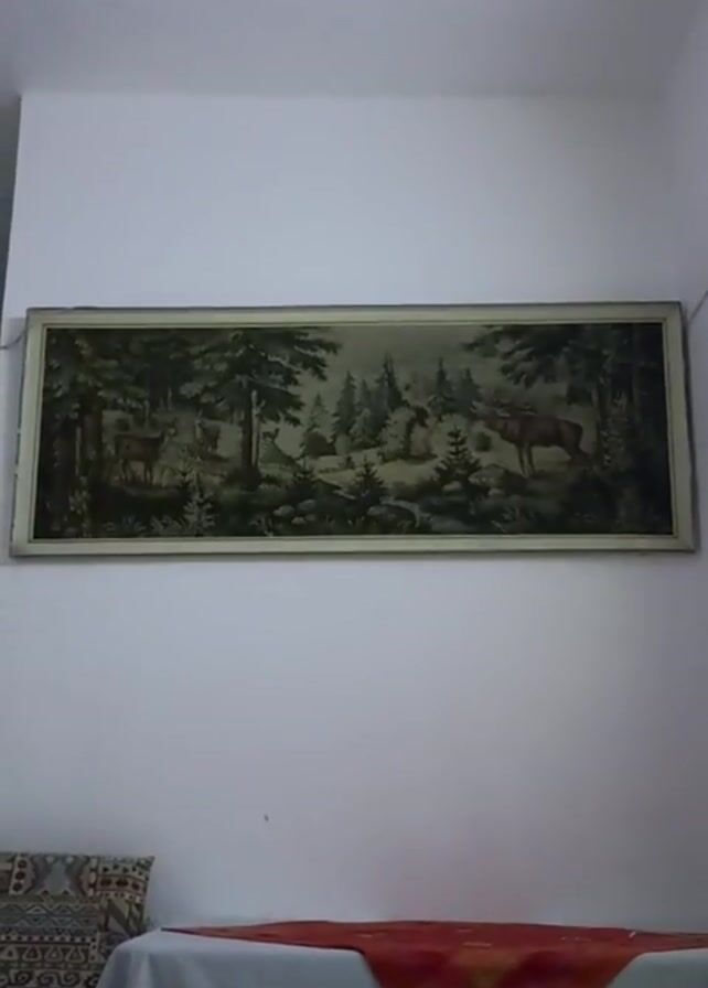 long framed painting hung on a white wall. The painting depicts a forest scene with several deer. A table covered with a white cloth and a red-and-white checkered runner is beneath the painting, along with a decorative cushion. The camera zooms in slightly on the painting to provide a closer view of the deer and forest details.