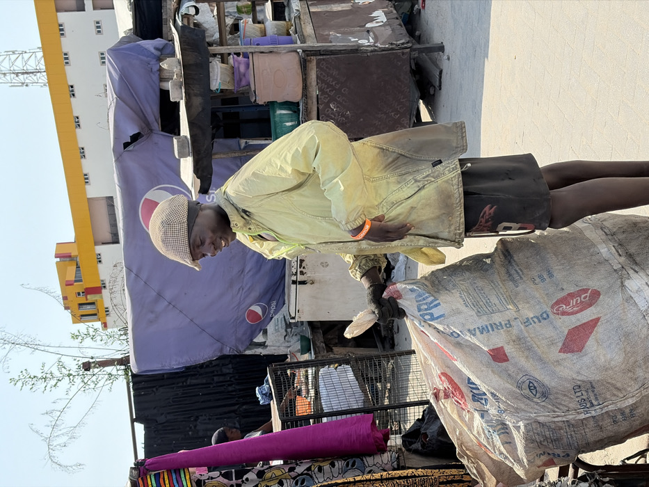 The image portrays an outdoor market scene in Igboefon, Nigeria, under clear daylight conditions. In the foreground, a dark-skinned male individual, appearing youthful, stands holding a large, soiled, off-white woven polypropylene sack marked with "PRIMA," "pure," and other blue and red text. He is barefoot, wears dark shorts with a white design, a dirty light-yellow long-sleeved jacket, a checkered flat cap, and an orange wristband on his right wrist. His left hand, covered by a black glove, holds a light-colored, elongated object extending from the sack's opening. He faces slightly left with a discernible smile. To the left of the main subject, a vertical display of colorful patterned fabrics is visible, partially obscuring a dark metal partition. Behind this, a second individual, partially obscured, is positioned near a metal cage or stall. In the mid-ground, a large purple tarp featuring multiple red and blue Pepsi logos acts as a canopy or wall for a vendor setup. To the right, a rustic wooden stall is visible, displaying various plastic containers, some yellow and translucent. A white chest-style cooler or refrigerator is situated between the colorful fabric display and the Pepsi tarp. The ground in the foreground is a light-colored, unpaved surface. In the background, a prominent building with bright yellow walls and white lower sections, accented with red, stands under a clear sky. Barbed wire is visible along a wall section in front of this building. Sparse green and dry vegetation, along with a metal trellis or antenna tower, are also present in the distant background.