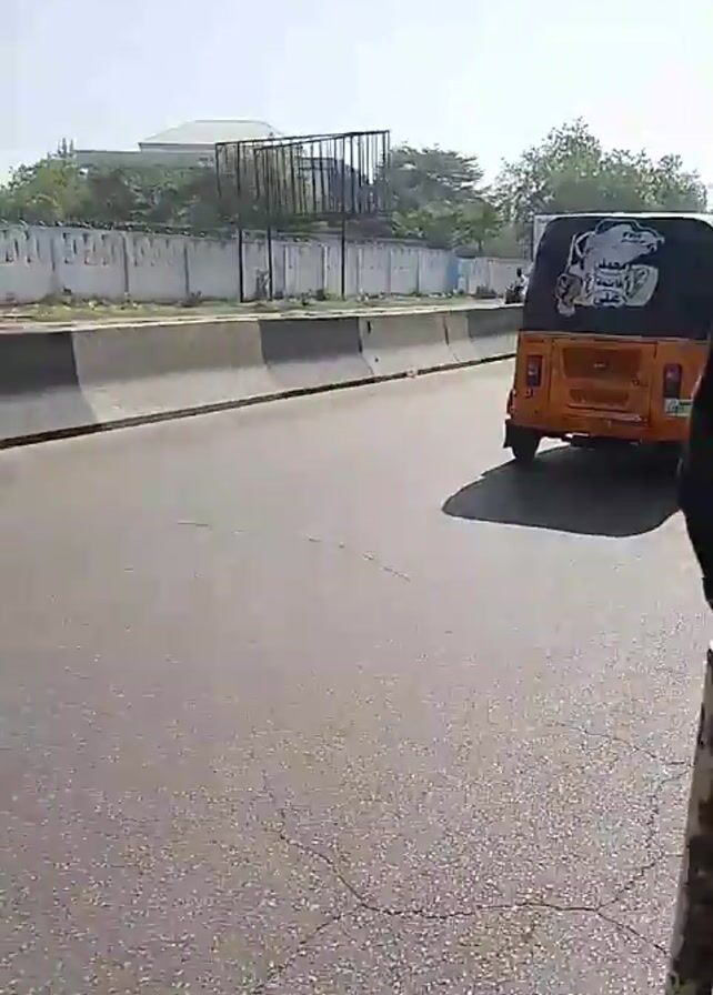 view from a moving vehicle, likely a motorcycle or another auto rickshaw, on a wide, paved road. In the foreground, part of the vehicle the video is taken from is visible on the right side of the frame. An orange auto rickshaw with a black canvas roof is driving in the same direction in the right lane, slightly ahead of the camera. There's a large sticker on the back of the rickshaw with Arabic writing and a cartoonish image. In the left lane, separated by a concrete divider, another auto rickshaw is visible. In the background, there's a building with a green roof, trees, and a large billboard. The sky is clear and bright. The video gives the impression of a typical day on a busy road in a sunny location.