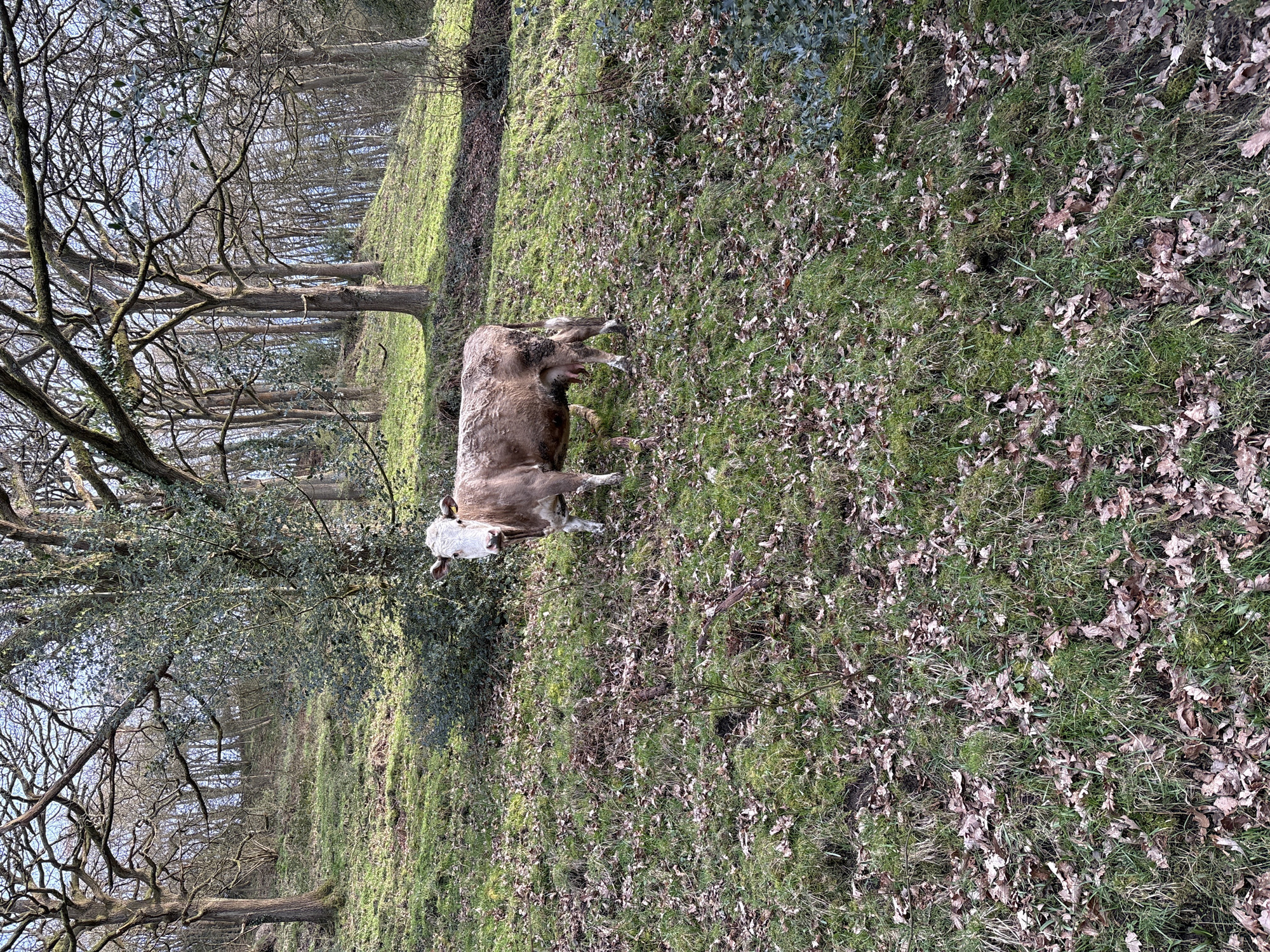 A light brown and white cow stands facing forward on a grassy, leaf-strewn incline within a wooded area in Snailbeach, United Kingdom
