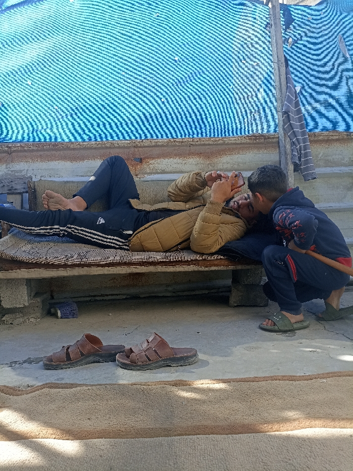 In the city of Gaza, Palestinian Territory, an adult male and a child are depicted in what appears to be an outdoor, partially covered area. The adult male, with a beard and wearing a tan puffer jacket and black track pants with white stripes, lies barefoot on a rudimentary wooden bench. A woven mat is placed on the bench. He holds a smartphone with both hands, his gaze directed slightly towards the child. A younger child, wearing a dark blue hoodie with red accents and dark blue pants, crouches next to the bench on the concrete ground, wearing green slide sandals. The child leans close to the adult male, holding a slender stick in their right hand. The background features a horizontally corrugated blue tarp or sheet, possibly serving as a roof or wall, mounted above a rusty-looking metal or concrete beam. A wooden post is visible on the right, from which a striped cloth hangs. On the concrete ground in the lower foreground, a light brown woven rug or mat is partially visible. A pair of brown leather sandals rests on the concrete near the bench. A blue-bristled brush is seen underneath the bench. The overall scene suggests a casual, outdoor domestic setting.