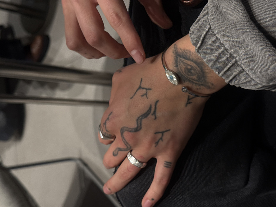 A person's hand, adorned with intricate tattoos, rests on a dark-colored surface. The tattoos feature an eye on the wrist, geometric shapes, and a winding snake design. Two silver rings embellish the fingers, while a slim silver bracelet with a blue stone accents the wrist. A second hand with a well-manicured nail is above. A gray denim jacket cuff is on the wrist.