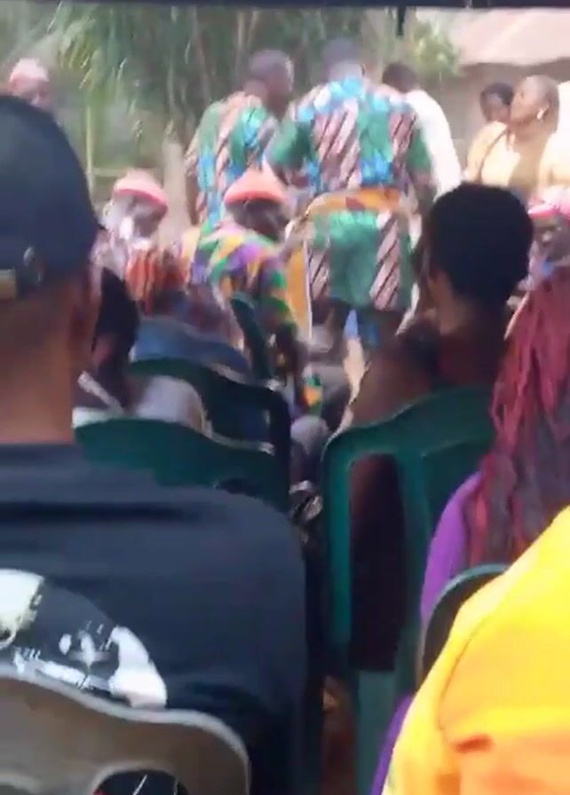 group of people gathered outdoors, seemingly at an event. Several men are seen wearing colorful, patterned outfits and traditional red caps, standing and walking around. Other people are seated on green plastic chairs, appearing to be watching the men. The environment looks like a yard or garden area with greenery visible in the background, possibly under a canopy or tent structure that provides shade. The video is shot from the perspective of someone sitting amongst the seated audience.