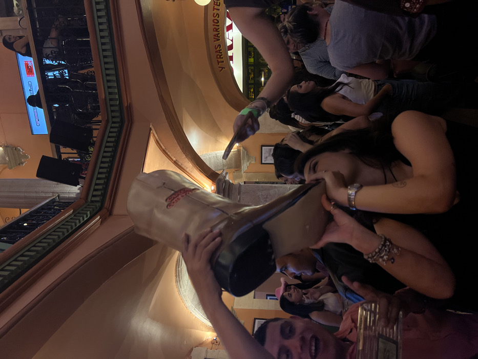 The image depicts the interior of a crowded, multi-level establishment, likely a bar or cantina, located in Guanajuato City, Mexico. In the central foreground, a woman with dark hair, wearing a black top, is actively drinking from a large, light-brown cowboy boot-shaped vessel. Her hands grasp the boot's shaft and toe, while two other arms, one from the left and one from the right, assist in holding the boot. The boot features a dark sole and a reddish, stylized design on its side. To the woman's immediate left, a man with dark hair is visible, smiling at the camera and holding a clear, multi-sectioned serving tray, possibly for shots. To the right, another person's arm holds a smartphone, pointed towards the woman drinking. The background shows a densely packed crowd of individuals on both the main floor and an elevated balcony. The establishment's architecture features warmly lit arched passageways and columns. The upper balcony is adorned with an ornate dark green and gold railing. On this upper level, two large black speakers are positioned next to a flat-screen television displaying a blue screen with graphics. Partial Spanish text, "Y TRAS VARIOS TE", is visible on a curved archway in the mid-ground. The overall lighting is warm, emanating from unseen fixtures and reflecting off the warm-toned walls, suggesting an evening or nighttime setting.