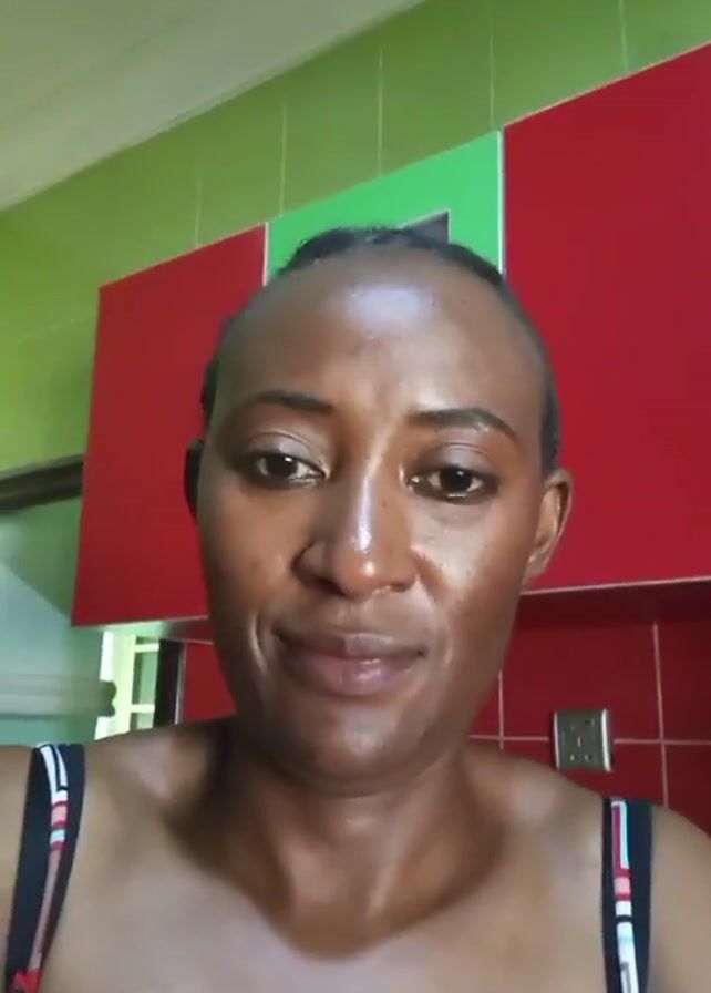 A woman with dark hair pulled back from her forehead is facing the camera and talking. She is wearing a red and teal patterned tank top with black straps. She is indoors, in a kitchen. The walls of the kitchen are tiled green, and the cabinets are a mix of red and green. There is a faucet and what appears to be a white appliance visible behind her. The sounds suggest running water.