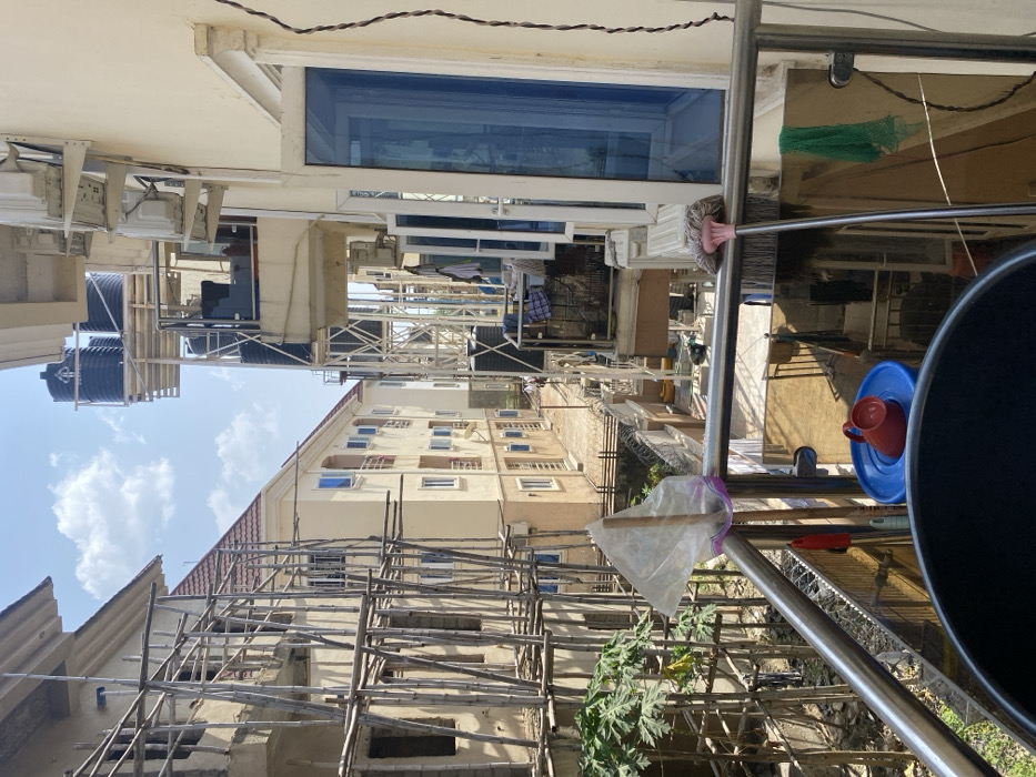 The image captures a residential street scene in Abuja, Nigeria, viewed from a balcony. In the foreground, a stainless steel railing supports a plastic bag containing a wooden stick, a pink-headed mop, a dark bucket, and a blue plastic basin holding a red plastic mug. To the immediate right, a cream-colored building wall features open windows with blue-tinted glass and multiple wall-mounted air conditioning condenser units. The perspective looks down into a narrow, unpaved alleyway that separates two rows of multi-story buildings. On the left, an unfinished building under construction is enveloped in extensive wooden scaffolding. Green foliage, possibly papaya trees, is visible at the base of this structure, adjacent to a low wall topped with razor wire. Across the alley, a finished residential building, painted light yellow/cream, displays numerous windows, balconies, and satellite dishes, topped by a reddish-brown tiled roof. Along the right side of the alley, several large black plastic water storage tanks are prominently mounted on tall, multi-tiered metal scaffolding structures, indicative of water supply infrastructure. Clothes are visible hanging on a line or railing from a balcony further down the alley on the right. A faint human figure appears to be in the distant part of the alley. The environment is illuminated by natural light under a blue sky with scattered white clouds. The architecture, the presence of numerous water tanks on scaffolding, and the style of construction are consistent with residential areas in Abuja.