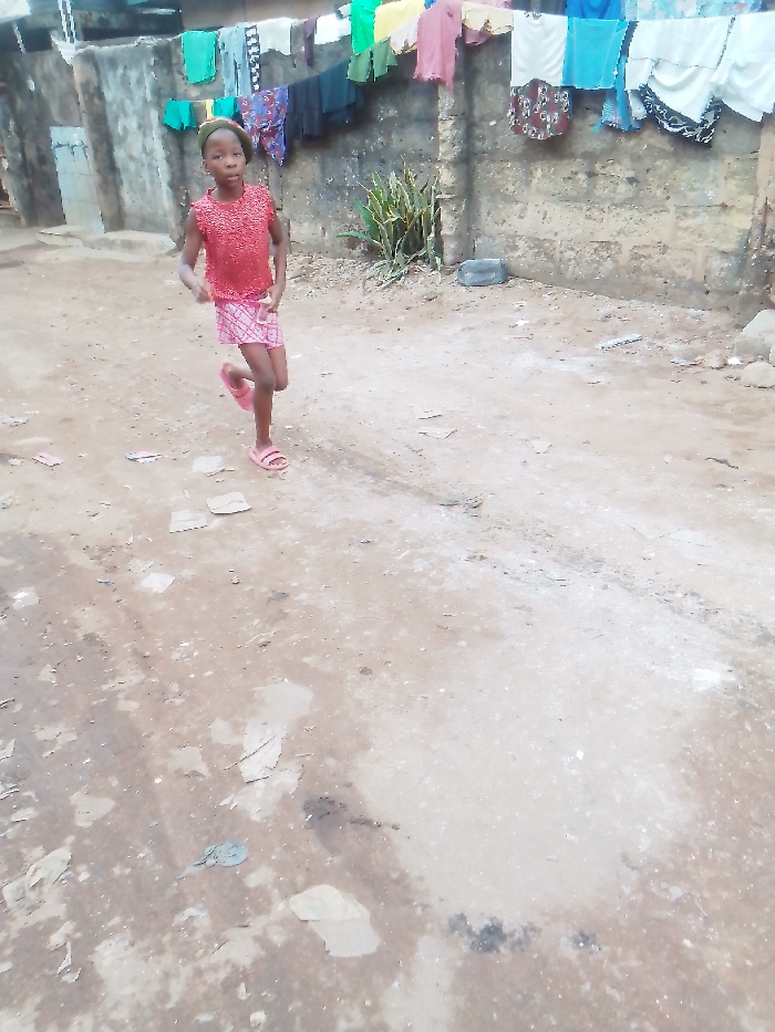 A young girl runs on a dirt path, wearing a red top, plaid shorts, and pink sandals. Clothes hang on a line above a stone wall behind her, and a lush green plant grows nearby. The path is cracked and uneven, with patches of wetness. A tire sits along the wall. The scene is a snapshot of everyday life, capturing the carefree energy of a child at play in a simple setting.