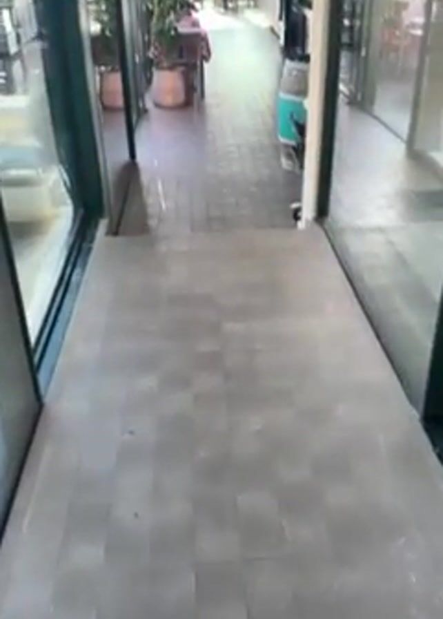 n interior shot of a restaurant or reception hall with tiled floors and large windows. A short ramp leads up to the main tiled floor. Tables are set with linens and potted plants, situated between the windows overlooking an outdoor area. A service bar or counter is visible in the distance, alongside an aqua-painted barrel that is closer to the camera. A faint child's voice is briefly heard during the video.