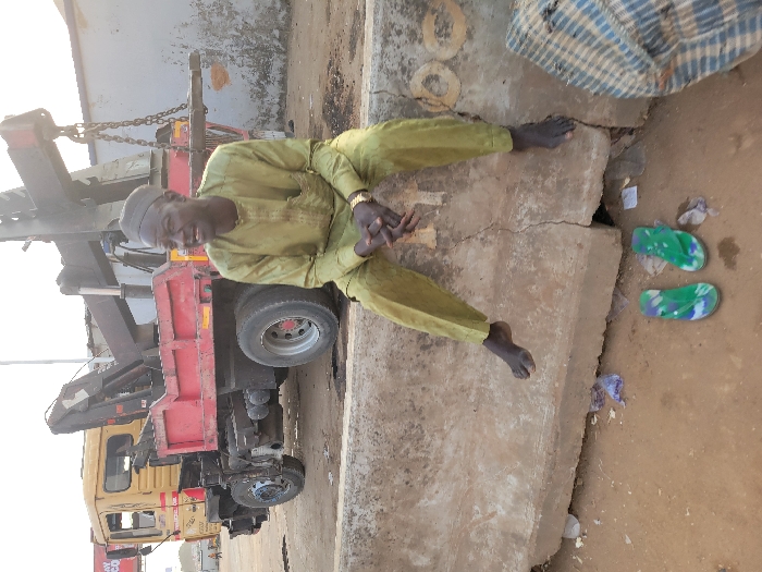 A man in a light green traditional outfit, seated on a cracked concrete structure, is next to a red and yellow crane truck. He wears a dark cap and a gold watch, looking towards the camera with a slight smile. Discarded litter and a pair of colorful sandals are near the concrete slab. The ground is predominantly dirt with some patches of concrete. A bag rests on the edge of the concrete next to the man. The scene appears to be outdoors in a partially industrial or construction setting.