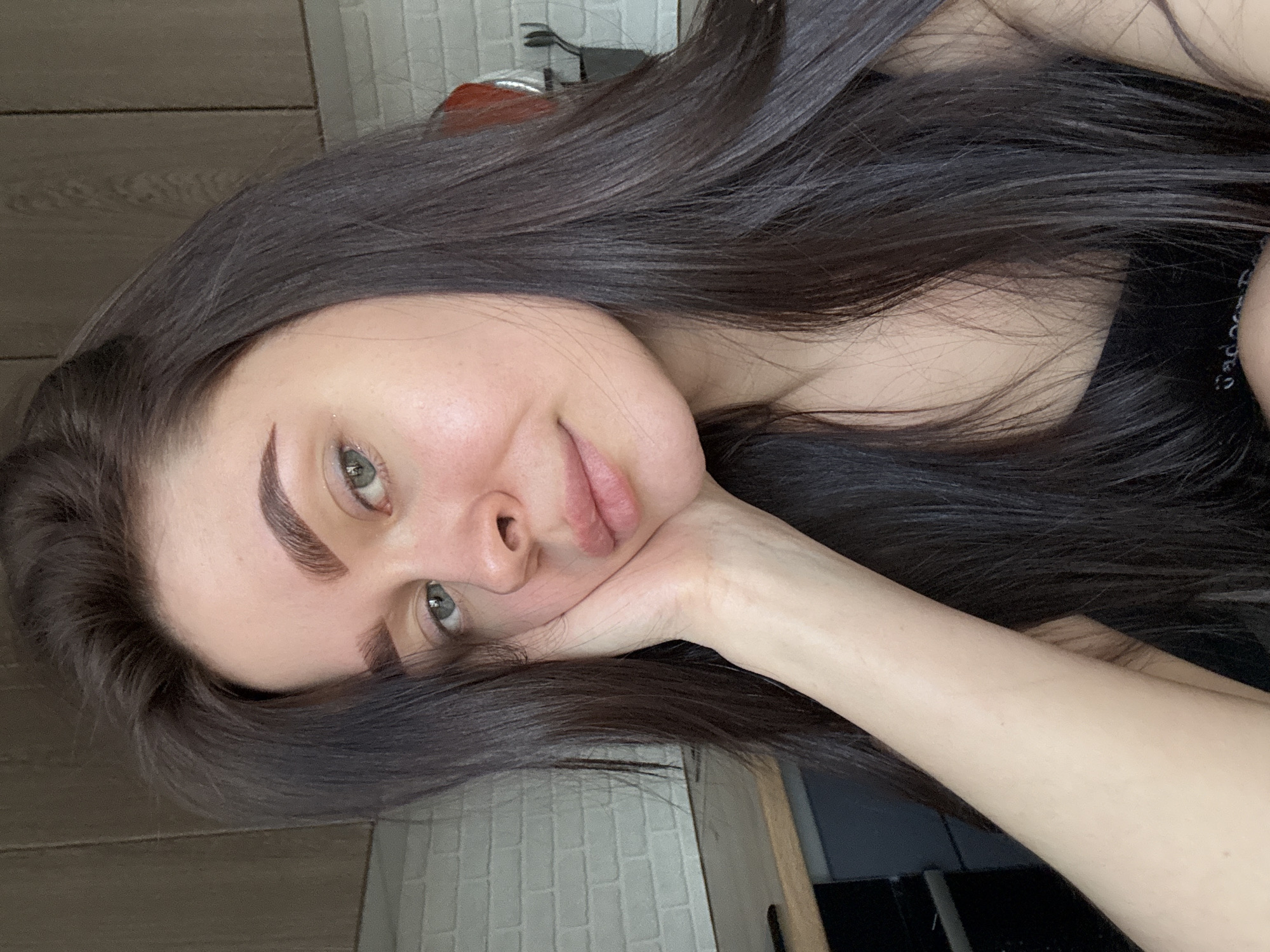 A young adult female is depicted in a close-up, head-and-shoulders portrait, situated within a residence in the city of Chaikovsky, Russia