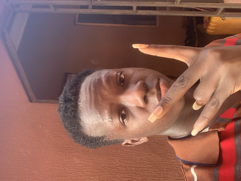A young man with short, dark hair faces the camera, making a "V" sign with his right hand. His skin appears slightly damp, possibly sweaty. He is wearing a brown shirt with red stripes. The background includes a brown wall, a framed window, and part of a metal structure above. The lighting suggests an outdoor setting.