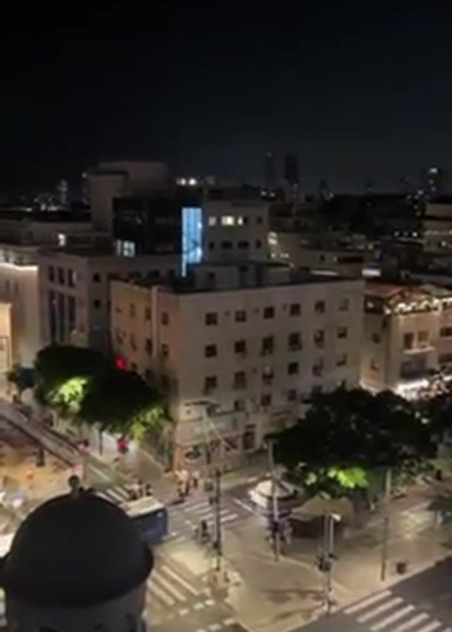 A night-time aerial view shows an urban intersection with multiple streets, buildings, trees, traffic lights, and pedestrians. A blue bus moves along one of the streets. The buildings are mostly light-colored and of varying heights. A distinctive dome-like structure sits in the foreground, partially obscuring the view. The sky is dark, and the city skyline is faintly visible in the distance. Streetlights illuminate the intersection and surrounding areas, highlighting pedestrian crossings and sidewalks. People are walking and crossing the streets.
