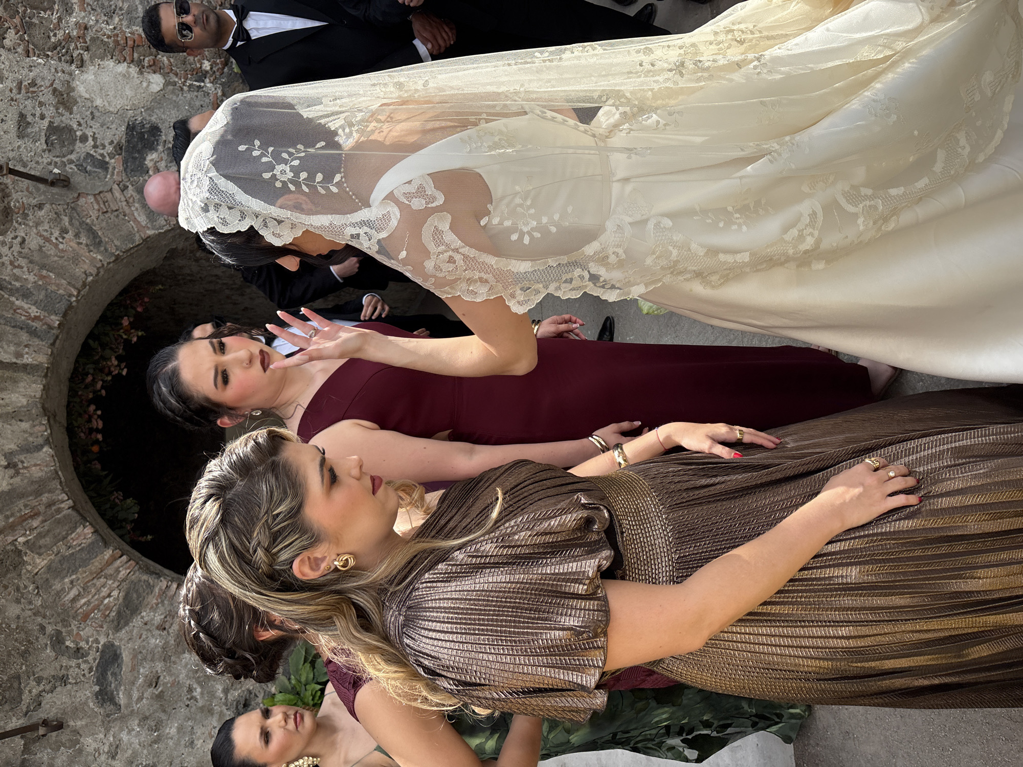 Here is a description of the image: The image captures a wedding scene in Progreso, Mexico. A bride in a white gown with lace detailing and a veil stands near an outdoor stone structure, possibly a gateway or archway. Around her are several people, including women dressed in bridesmaid attire, one in a burgundy dress and another in a brown pleated dress. A man in a tuxedo is partially visible in the background. The setting suggests an outdoor wedding venue.
