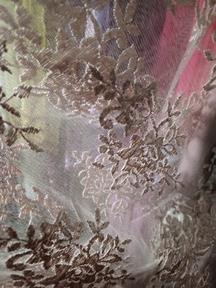 The image displays a close-up, high-detail view of a sheer, translucent textile fabric, located in Phakeo, Laos. The fabric features an intricate, embroidered pattern of floral and foliage motifs, rendered in a light to medium brown or bronze color, resembling lace. The base material of the fabric is a fine mesh or netting, appearing light beige or off-white. Through the translucent fabric, diffuse background colors are discernible: pale yellow and light green tones on the left side, transitioning to pink, purple, and reddish hues on the right. There are no individuals, explicit actions, or specific identifiable objects beyond the textile itself. The lighting is soft and diffused, highlighting the texture and translucency of the material.