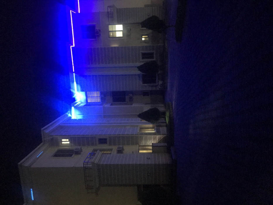 The image depicts a multi-story building complex at night in Ushapa, Nigeria. The building features light-colored exterior walls, multiple windows with some illuminated interior spaces, and prominent vertical architectural elements, including pillars and sections with balustrades. Extensive blue LED strip lighting is installed along the roofline and architectural cornices of the structure, casting a distinct blue glow that illuminates the upper portions of the building and reflects faintly on the ground. Several air conditioning units are mounted on the exterior walls. In front of the building is a dark, paved surface, consistent with interlocking pavers. Multiple small, conical evergreen trees are interspersed within landscaped sections directly adjacent to the building's base. The sky is dark, indicating nighttime conditions. No individuals or discernible actions are present within the scene.