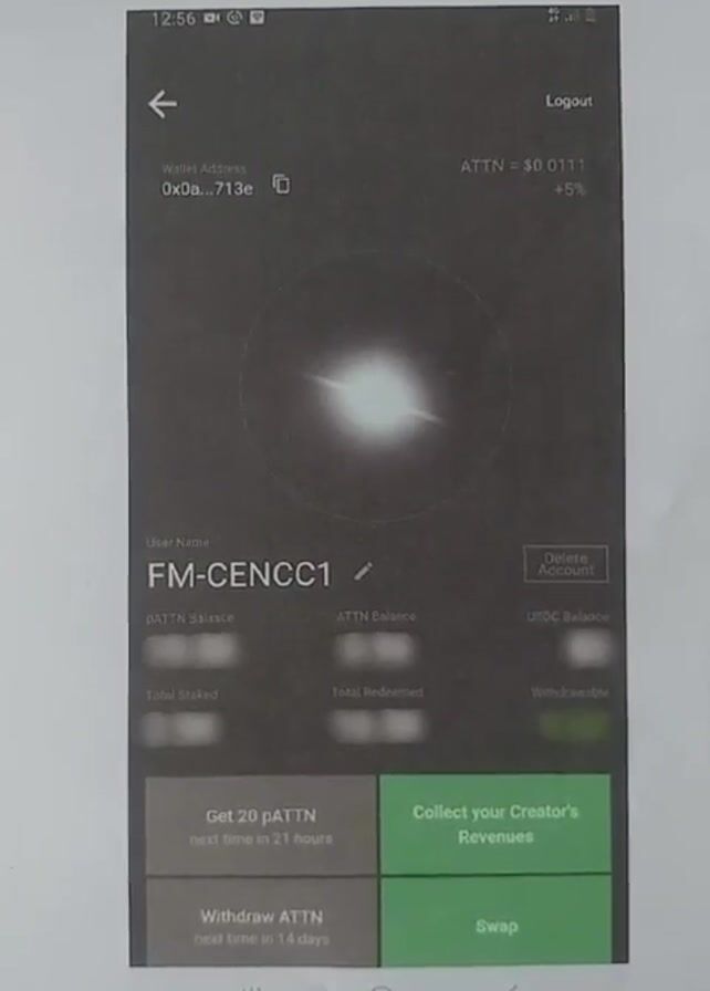 The image depicts a printed screenshot of a mobile phone display. The screen shows an application interface, likely related to cryptocurrency or a financial platform. The interface features the user's wallet address, account username ("FM-CENCC1"), and balance information for different tokens. The user also sees options to "Collect your Creator's Revenues," "Swap," and "Withdraw ATTN," with timers indicating when the next actions can be taken. At the top right corner, there is a logout button. The print is placed on a white surface, with edges of a black object visible in the upper left corner of the image. The image quality is slightly grainy.