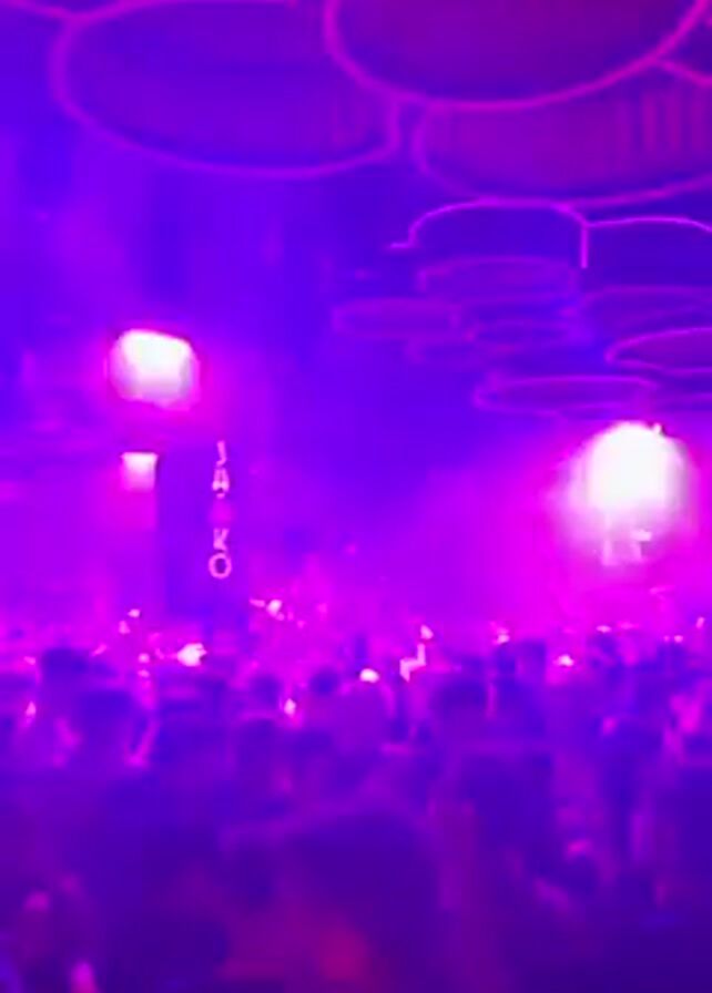 crowded nightclub. A large crowd of people are standing and appear to be dancing. Above them, the ceiling is decorated with circular, golden-colored light fixtures. Stage lighting changes colors from white, to purple, to red, illuminating the room and creating a hazy atmosphere. A vertical sign that says "SHOKO" is visible in the background.