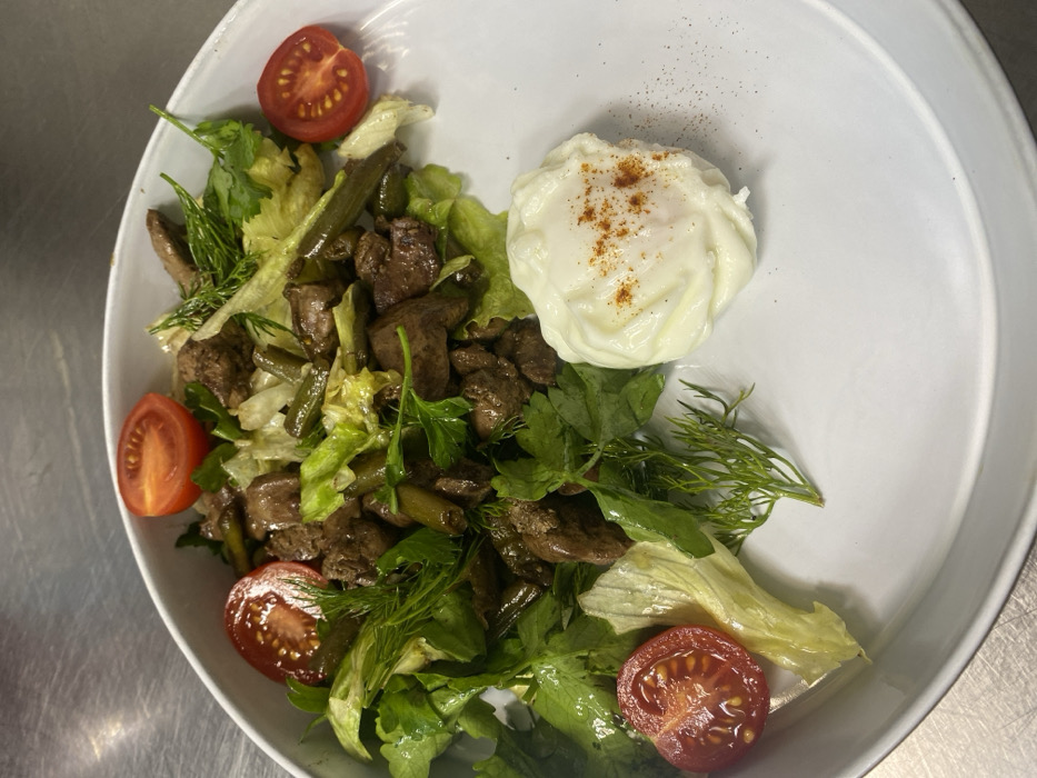 A close-up, top-down view shows a prepared meal served on a white, slightly oval plate. The dish features an arrangement of cooked liver pieces interspersed with torn green leaf lettuce, cut sections of green beans, and fresh herbs including parsley and dill. Three halved red cherry tomatoes are positioned around the perimeter of the greens. A single poached egg, lightly dusted with a red powdered spice, is situated on the lower right portion of the plate. The white plate rests on a textured metallic surface, identified as a stainless steel countertop. The scene is located in Chaikovsky, Russia.