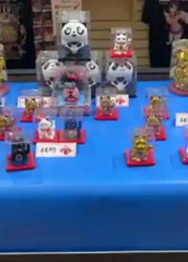 table display of various figurines, predominantly of cats, in what appears to be a store setting. The figurines are arranged on a blue tablecloth. Several of the figurines are in clear plastic cases, some elevated on red platforms. A few larger figurines, including panda designs, are also present. Price tags are visible near some items, indicating they are for sale. T-shirts are visible in the background on a display rack. The scene seems to be within a retail environment.