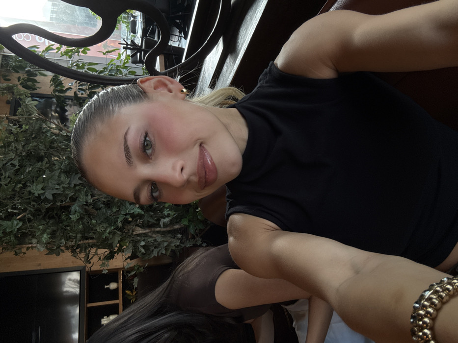 A fair-skinned woman with slicked-back blonde hair poses for a selfie. She wears a black, high-necked top. Her makeup is subtle, with blush highlighting her cheekbones and glossy lips. She is smiling slightly. Beside her is another person with long, dark hair, wearing a brown top. The background includes indoor plants and what appears to be an indoor seating area. A dark cabinet is visible in the background.