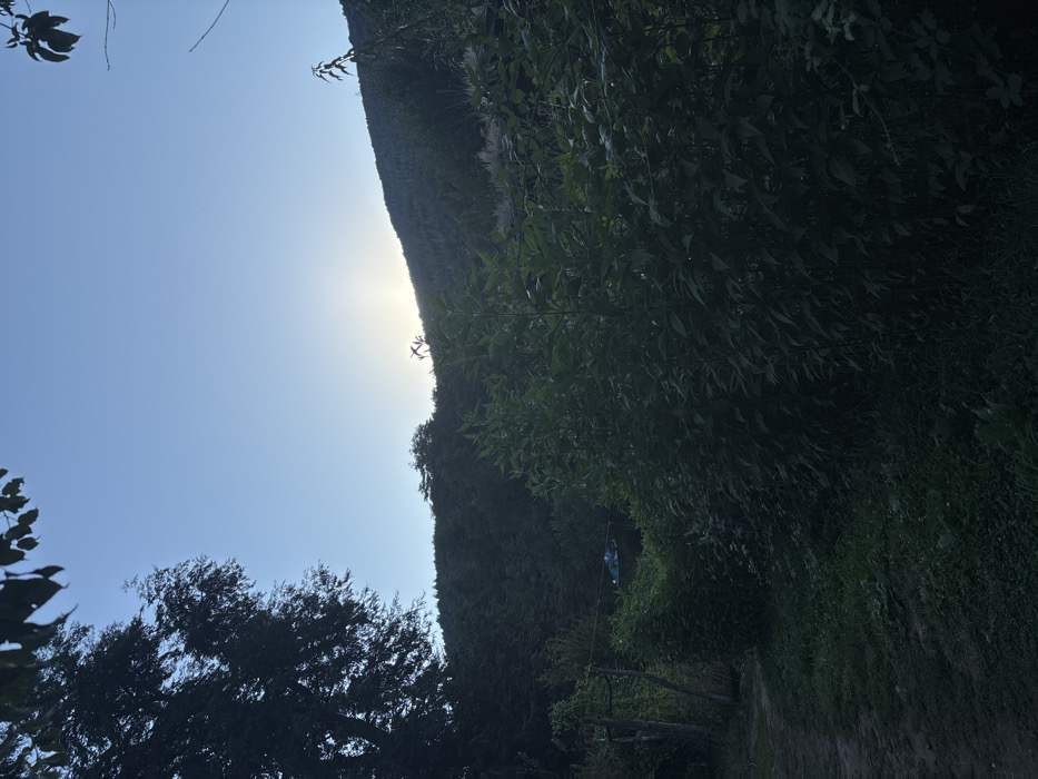 A view of tall trees against a bright sky. The sun is partially obscured, shining through the foliage near the top center. Dense greenery dominates the right side, contrasting with the clear blue sky on the left. A dark, leafy tree is visible in the lower left corner. The image is oriented sideways.