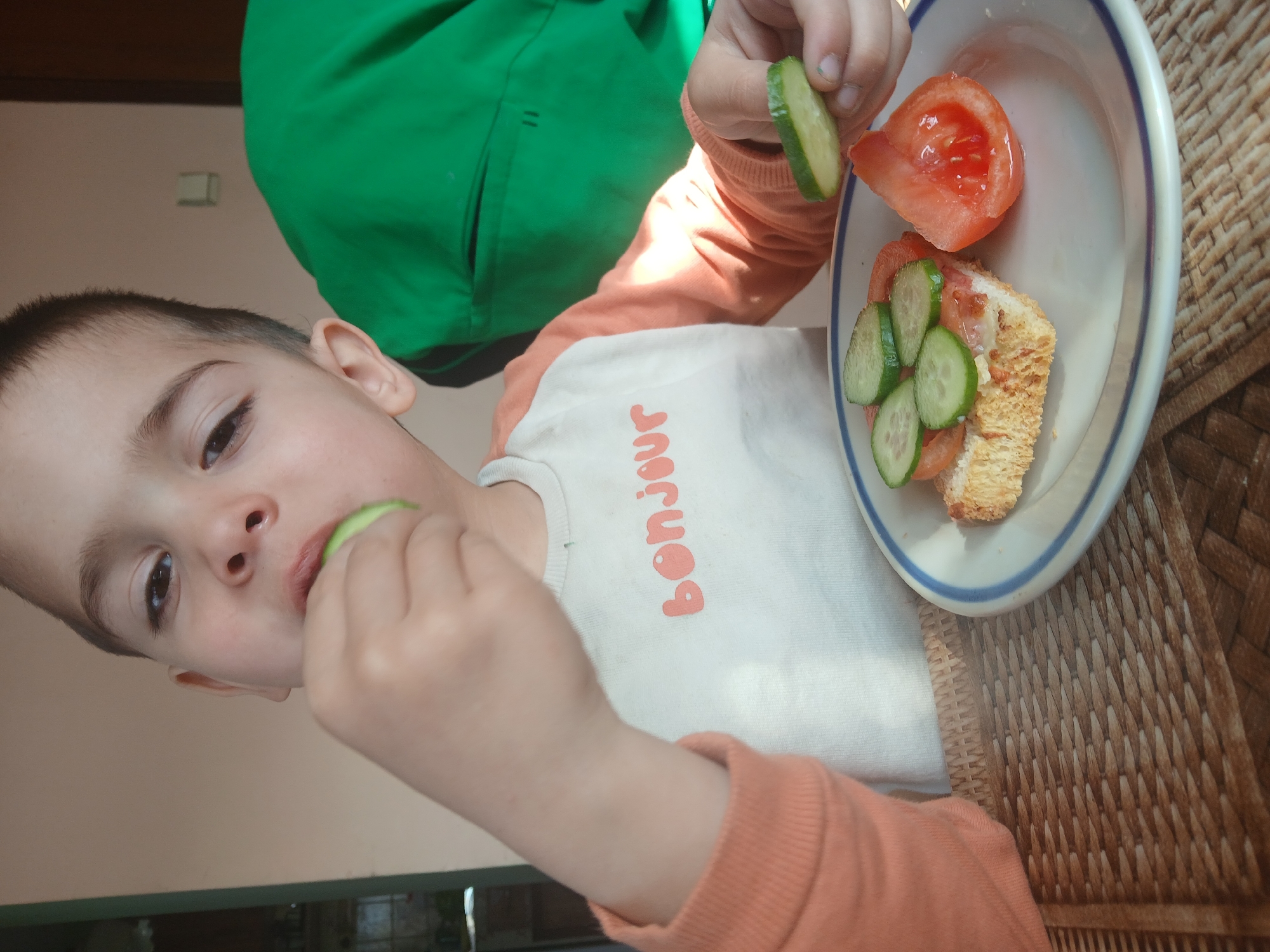 A young child, approximately 4-7 years old, is depicted in a domestic setting within Obrochishte, Bulgaria, engaged in eating. The child, with dark hair, is positioned in the foreground, facing forward, and is shown consuming a slice of green cucumber held to the mouth with the right hand. Another cucumber slice is held in the left hand above a white plate with a blue rim. The child wears a white long-sleeve shirt with orange raglan sleeves, featuring the word "bonjour" in orange text. On the plate, a piece of toasted bread is visible, topped with a slice of tomato and multiple circular cucumber slices. Adjacent to the bread, a quartered tomato lies on the plate. The meal is situated on a woven brown placemat or table surface. A second individual, wearing a green garment, is partially visible behind and to the right of the child. The background consists of light-colored walls, with a dark vertical structure on the left and a wall-mounted fixture on the right.