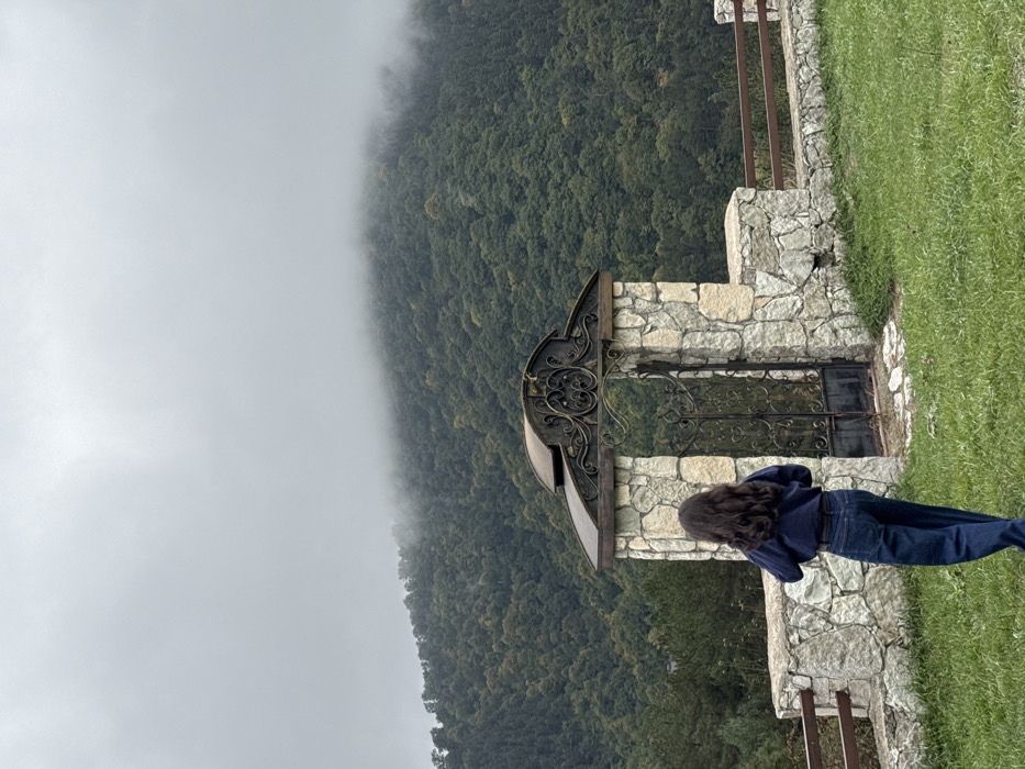 An outdoor scene in Dilijan, Armenia, features a lone individual positioned centrally on a green grassy slope, observed from the rear. The person has long, dark hair and is dressed in a dark blue long-sleeved top and dark blue jeans. They are facing a decorative stone archway constructed from light-colored, irregular stones. The archway is topped with a dark, ornate metal canopy featuring intricate scrollwork, beneath which is a closed, dark wrought-iron double gate with decorative patterns. Low stone walls extend from both sides of the archway; the wall on the right is topped with three horizontal wooden fence rails. In the background, densely forested mountains rise, their upper slopes and peaks partially obscured by thick, low-hanging mist and an overcast, grey sky. The overall lighting is diffuse.