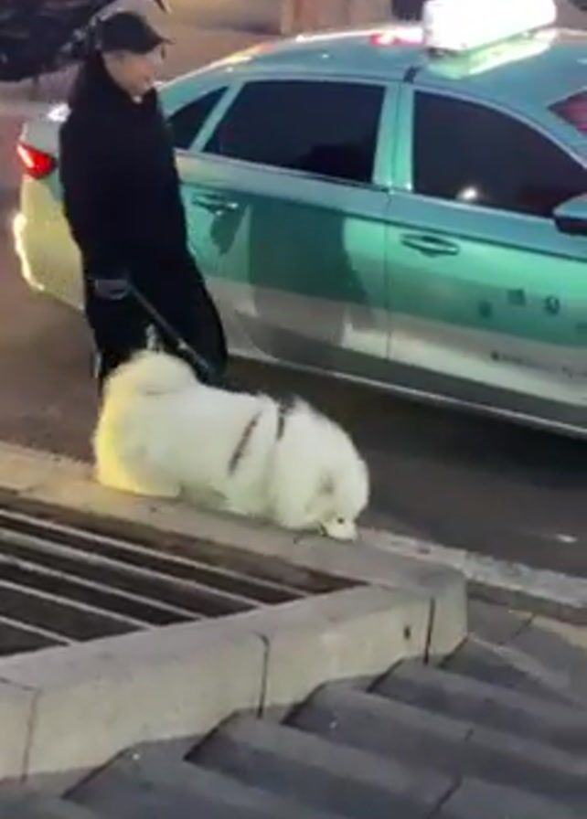Here is a brief description of the video: The video shows a man walking a large white dog down a set of stairs onto a city street