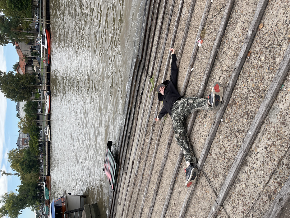 The image depicts a waterfront scene in Tigre, Argentina. In the foreground, a single individual lies supine on a sloped embankment constructed from concrete interspersed with horizontal wooden beams. The person is dressed in a dark hooded sweatshirt, camouflage-patterned trousers, and black athletic shoes with red accents, with a dark cap on their head. Their arms and legs are outstretched, and their eyes appear closed or looking upwards. Adjacent to the person, closer to the water, a rectangular, multi-colored (green, red, dark) floating platform is partially submerged and angled into the choppy, brown water. Dark tracks extend from the embankment into the water beneath this platform. On the far left, a portion of a white boat with a blue stripe is visible, docked near the embankment. Across the waterway, several boats are moored along the opposite bank, including a small white motorboat, a longer white and brown boat, and an orange and white speed boat. Behind these boats, a tree-lined promenade or road is visible, with various residential or commercial buildings, some featuring red-tiled roofs, situated further back under a partly cloudy sky.