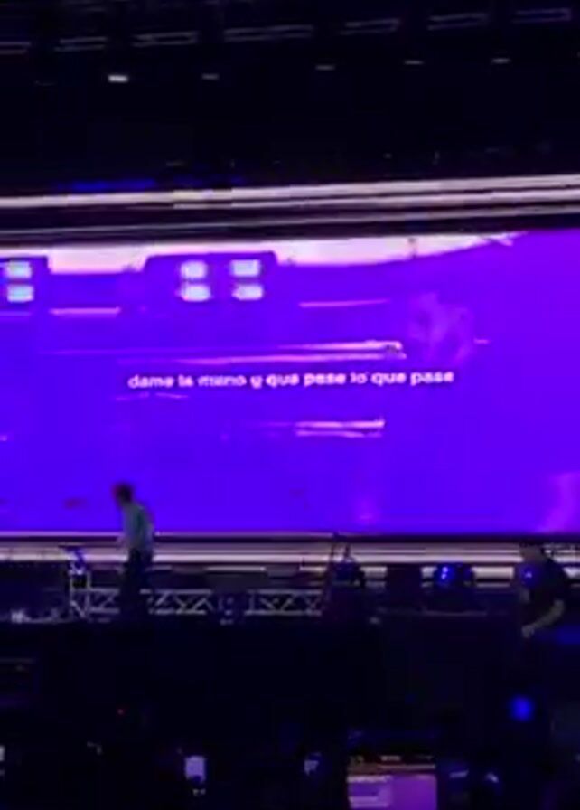 A concert is taking place. The stage is lit with bright blue lights. A large screen displays a video of a man rapping. In the foreground, there is a blurry view of the audience and some members of the band on stage.