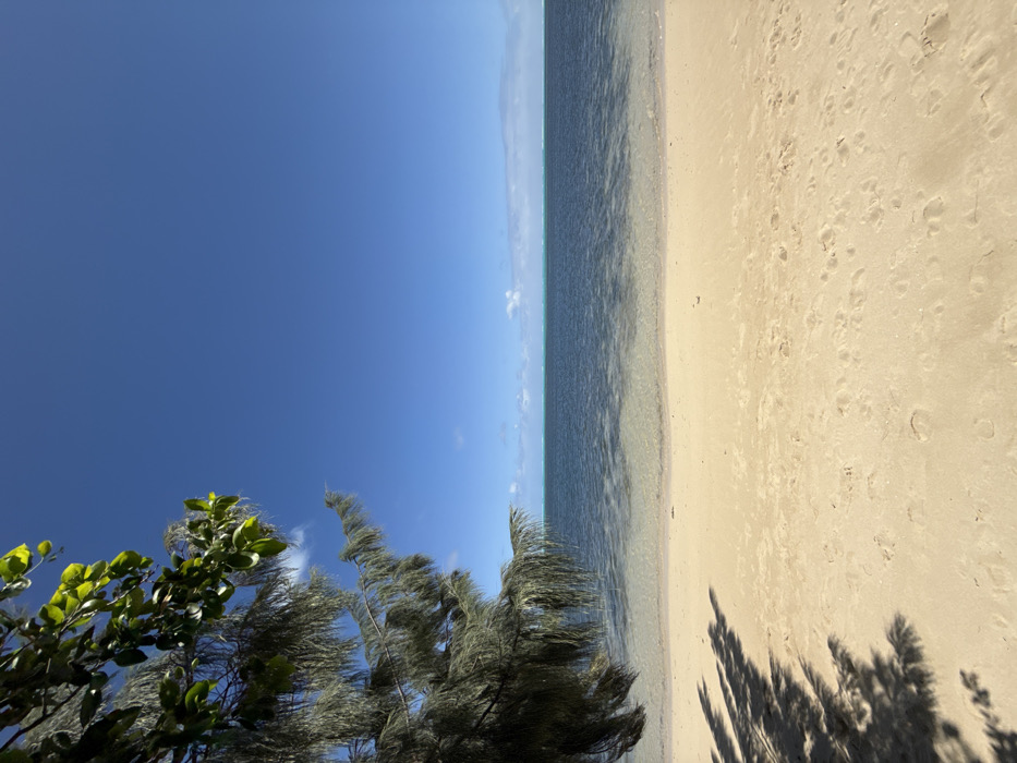 The image presents a sunlit coastal landscape located in Bourail, France. The scene is bisected horizontally by the horizon line, with approximately two-thirds of the frame occupied by a clear, deep blue sky containing minimal, scattered white cumulus clouds near the horizon. The lower third of the image is dominated by light golden-colored sand, showing multiple indistinct footprints and shallow depressions, characteristic of a beach. The sand gently slopes towards the water. The ocean exhibits a clear, shallow, light-colored zone closest to the shore, transitioning into a deeper blue-green body of water further out, with a distinct band of lighter turquoise water visible at the distant horizon. On the left side of the frame, a large tree with dense, dark green, needle-like foliage extends from the upper and left edges, casting elongated, dark shadows across the sand in the lower-left quadrant. Brighter green, broader leaves are also visible within the upper-left foliage. No individuals, animals, or man-made structures are visible within the frame.