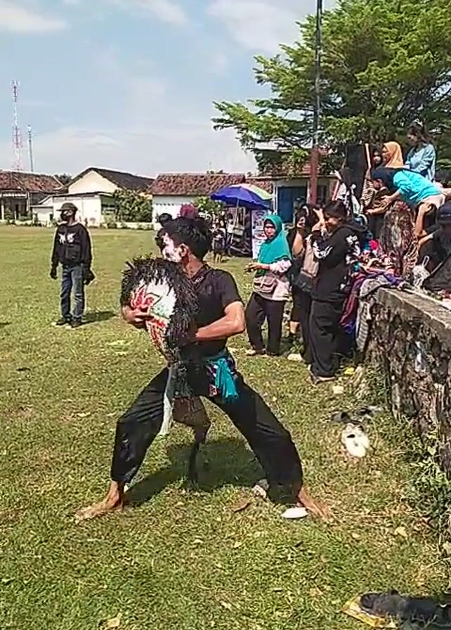 A dancer wearing a black shirt and pants, as well as a decorative mask and a patterned cloth, performs barefoot in a grassy field. Behind him, a small crowd watches from behind a low concrete barrier. A man in a black jacket stands to the dancer's left. The sky is visible in the background.