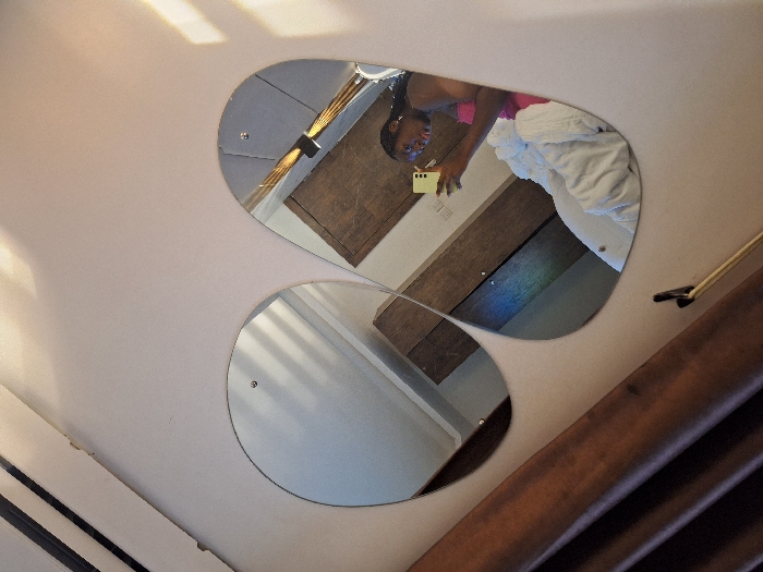 Two uniquely shaped mirrors are affixed to a neutral-toned wall. The upper mirror reflects a partial view of a person in pink holding a yellow smartphone, bedding, and a wooden surface. The lower mirror reflects a neutral-colored wall with white borders. A wooden curtain rod and curtains are partially visible in the lower right corner. Sunlight illuminates the wall in the upper left.