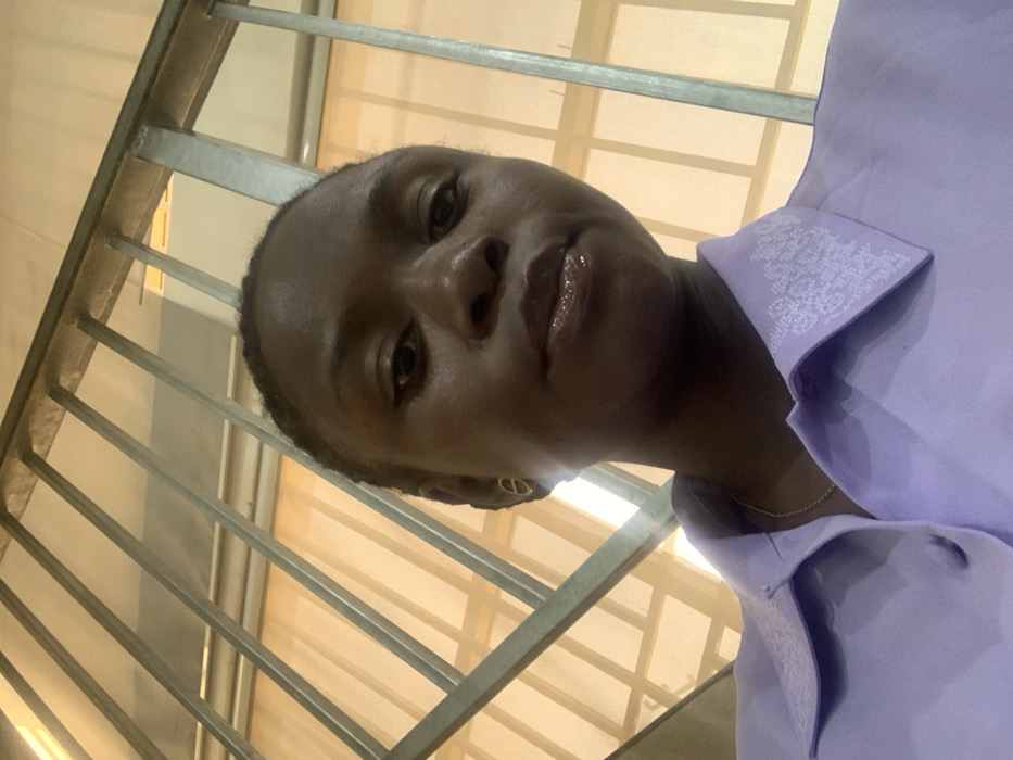 The image displays a close-up, upward-angled portrait of a single individual, a female with dark skin and braided hair, looking directly towards the camera. She wears a light lavender-colored collared shirt featuring white embroidered patterns on the collar tips. A thin, gold-colored chain necklace is visible around her neck, and a small, gold-colored circular earring is present in her left ear. Her lips have a glossy appearance. The background consists of a metallic structure with diagonal and horizontal bars, appearing to be a railing or security bars, set against a light, warm-toned wall or surface. The specific location within the city of Arawa, Nigeria, is not discernable from the visual information provided. The scene appears to be indoors under artificial or diffused natural light.