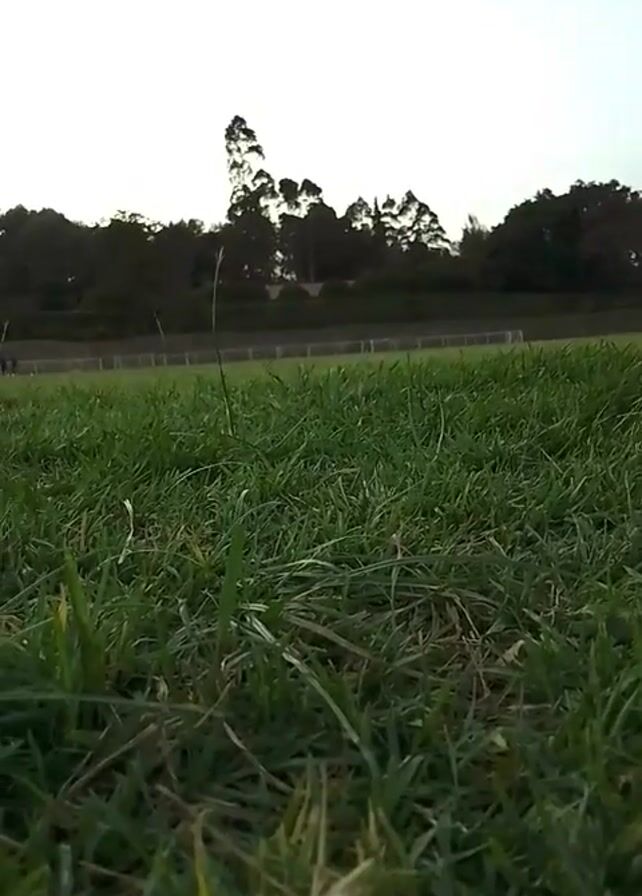grassy field from a low perspective. In the background, a line of trees is visible against a light sky. There appear to be people walking along the track surrounding the field in the distance. The camera remains still throughout the video.