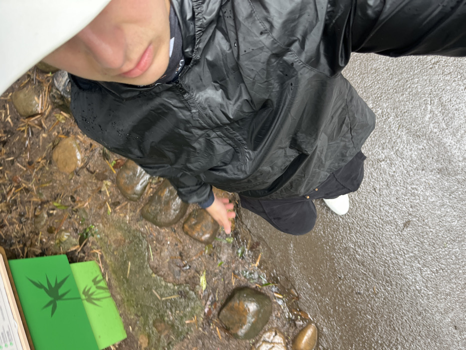 An overhead, slightly angled image depicts a single individual standing on a wet, dark gray paved path. The person wears a black waterproof jacket, black trousers, and a visible white shoe on the right foot. Water droplets are present on the jacket. The person's face is partially obscured by a white hat or hood, with the chin, lips, and lower nose visible. The right hand is extended downwards towards an adjacent unpaved area. This unpaved section consists of wet, dark brown soil, scattered smooth, wet brown rocks, and minimal organic debris. In the upper-left quadrant, a two-tiered green structure is present on the unpaved ground. The upper tier, a vibrant green, features a dark green stylized bamboo silhouette graphic. The lower tier is a lighter green. A light-colored sign board with text is partially visible atop this green structure. The scene is consistent with an outdoor park or conservation area, specifically within the city of Chengdu, China, possibly a panda-related facility or botanical garden, given the bamboo motif.