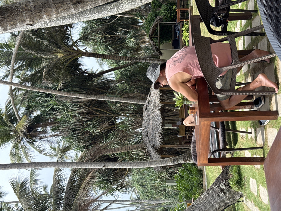 A man in a pink tank top and hat leans on a dark wooden table, appearing to be resting. He is seated at an outdoor patio with dark chairs and a lush background of palm trees and other foliage. Sunlight filters through the trees, creating a relaxed atmosphere. The table setting includes glassware and cutlery, suggesting a dining experience.