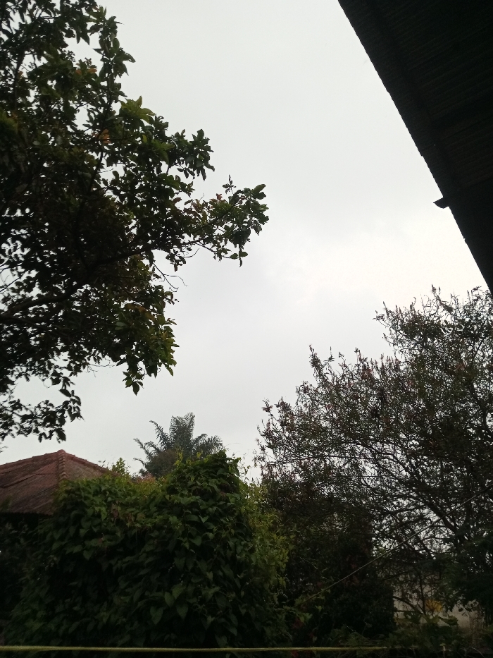 This image depicts an outdoor scene in Ivato, Madagascar, under an overcast sky. The upper portion of the frame is dominated by a uniform, light grey sky. In the upper left quadrant, a dense canopy of a broadleaf tree, characterized by dark green foliage, extends into the frame. The upper right features a dark, corrugated metal roofline, angled downwards from right to left, indicating the eaves of a structure. Below the tree canopy on the left, a reddish-brown tiled roof is partially visible, situated behind an extensive mound of dense, dark green foliage, possibly a shrub or vine-covered structure. A tall palm tree with distinct fronds is discernible in the mid-ground, rising above this dense foliage towards the center-left. To the right of the palm tree and extending into the mid-right and lower right, another tree exhibits sparser, darker foliage with some reddish-brown tones, possibly flowers or immature leaves. A thin, horizontal dark bar or fence element is faintly visible across the lower foreground, partially obscured by vegetation. No individuals, discernible actions, or interactions are present within the scene. The lighting is diffused, consistent with an overcast or heavily shadowed environment.
