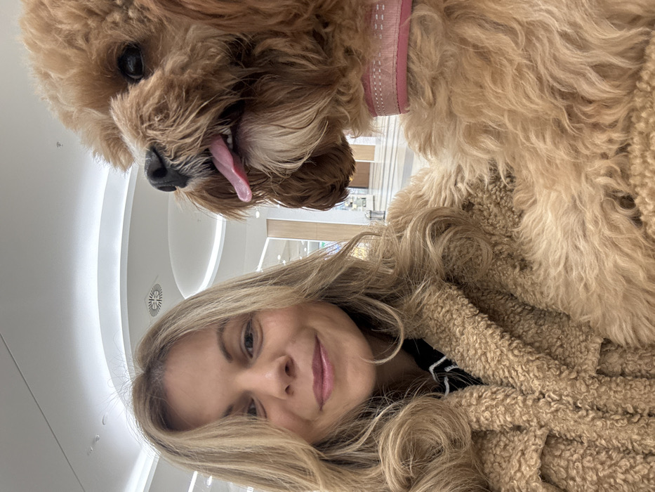 The image depicts an indoor scene within a modern shopping mall in Burgas, Bulgaria. An adult female with long, wavy blonde hair and a light complexion occupies the left side of the frame, looking directly at the camera with a slight smile. She is wearing a light brown, textured, faux-fur coat over a dark garment with a white patterned collar. To her right, a small to medium-sized dog with fluffy, reddish-brown fur is positioned, facing slightly upwards and to the right. The dog wears a pink collar with white stitching and has its pink tongue extended from its mouth. The background features a brightly lit, spacious mall interior with a high white ceiling, circular light fixtures, and square ventilation grates. A wide corridor with light-colored tiled flooring and distant storefronts is visible behind the subjects. The image appears to be a close-up selfie-style photograph.