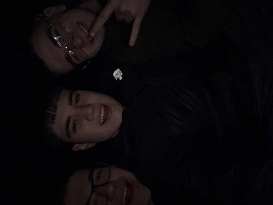 The scene depicts three individuals in a dimly lit environment in Stara Zagora, Bulgaria. The image is a close-up, likely a selfie, with the background uniformly black due to extreme darkness. **People:** 1. **Left individual:** Partially visible, only the left side of their face is present. They wear dark-framed glasses and display a smiling expression. 2. **Center individual:** Fully visible, appearing to be a young male with short, dark hair featuring a prominent fringe. They are smiling broadly with an open mouth, revealing teeth and tongue. They wear a dark, possibly padded, jacket. A white 'The North Face' logo is visible on the left chest area of their jacket. 3. **Right individual:** Partially visible, only the right side of their face and upper torso are present. They wear large, light-colored, possibly metal-framed glasses and exhibit a smiling expression. **Actions and Interactions:** The individual on the right has their right hand raised to their face. Their index finger is positioned against their lips, while their thumb and pinky finger are extended in a gesture commonly associated with "rock on" or a "shaka" sign. All three individuals are smiling, positioned in close proximity, suggesting a friendly or casual group pose. **Environment:** The entire background is undifferentiated black, indicating extremely low light conditions or a setting where no background features are discernible. The faces of the individuals are illuminated by an artificial light source, likely a camera flash or a phone screen. The precise location within Stara Zagora cannot be visually determined from the image.