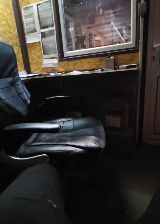 low-angle view of a room with plywood walls and a concrete floor. There is a black leather office chair in the foreground, and two boxes labeled "WURTH" are visible behind it. A desk runs along the wall with two windows above it. Through the windows, you can see a workshop area with wooden beams and various objects. A white-framed door with a glass pane is to the right of the desk, offering another view into the workshop. There's also an older green chair with armrests near the door, and a calendar hanging on the wall. The lighting is dim. A person wearing dark-colored pants is partially visible at the bottom of the frame.