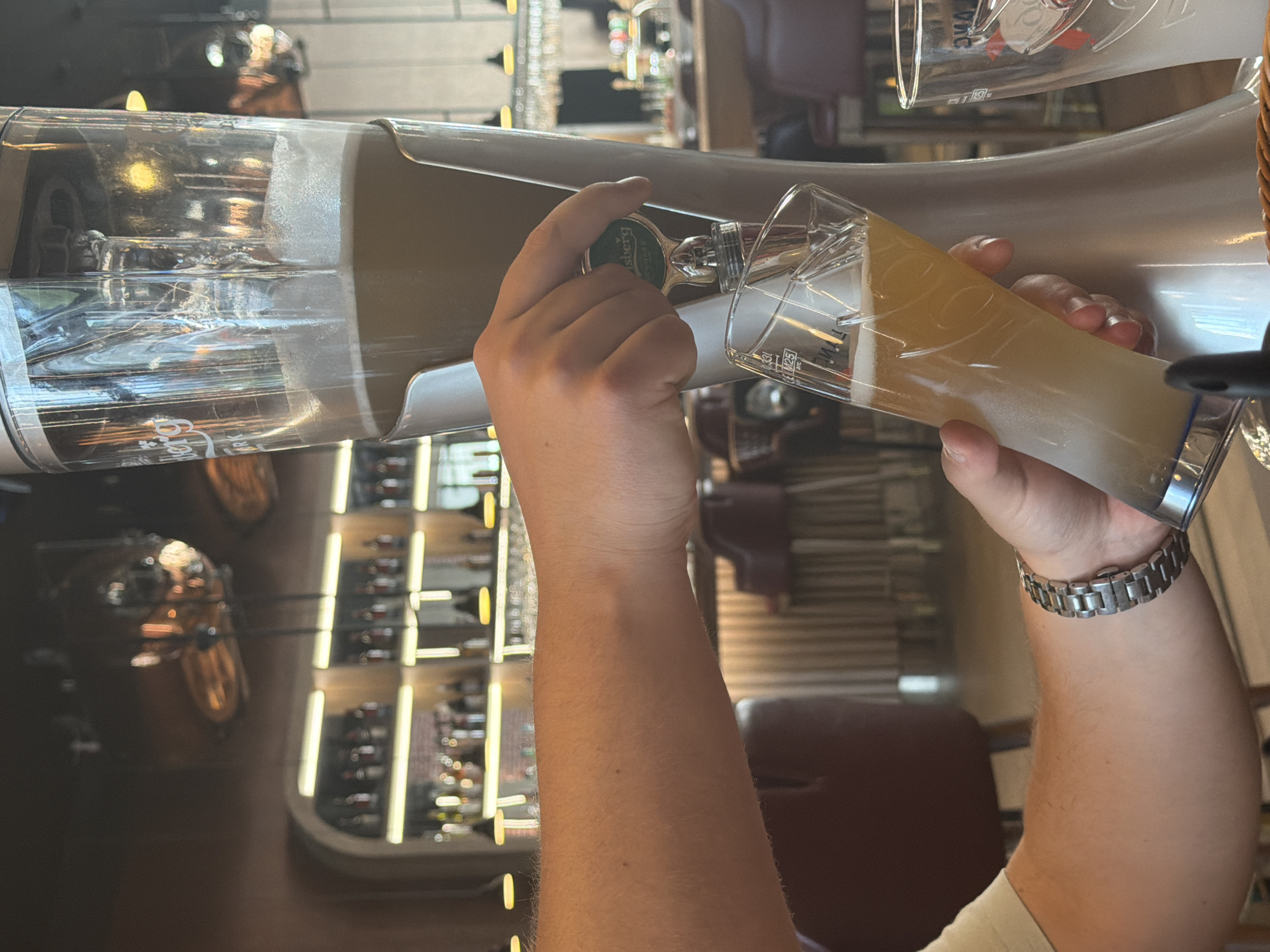 A person is pouring beer from a tap in what appears to be a bar or restaurant