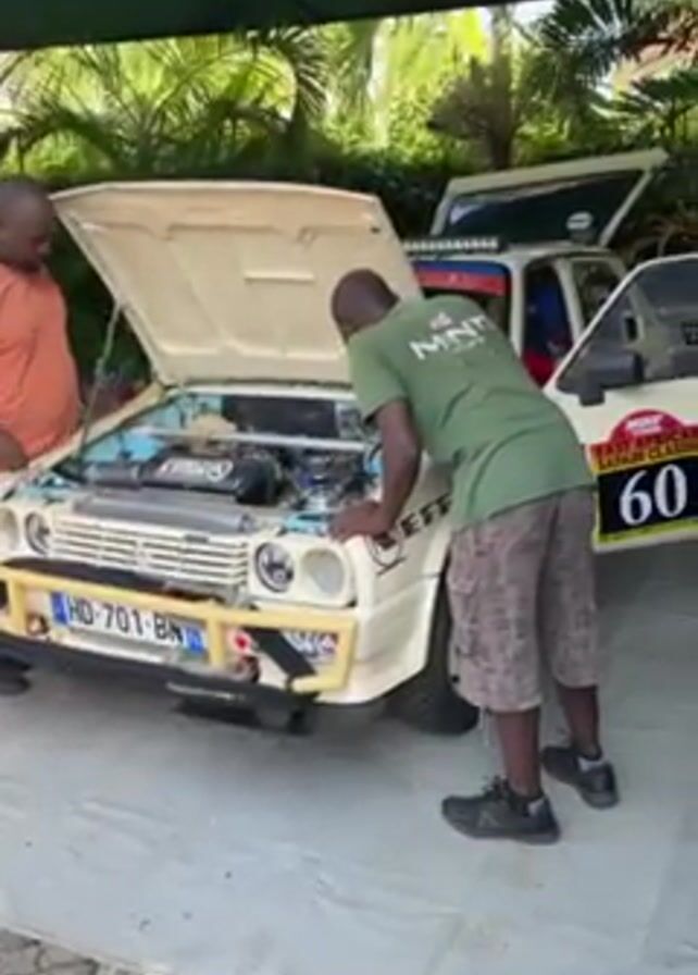 Two men are working on the engine of a white car. The car's hood is open and the men are peering into the engine compartment. The car has a roll bar and a front bumper guard, and the number 60 is painted on the side. The license plate reads "HD-701-BN". The man on the left is wearing an orange shirt, and the man on the right is wearing a green "MINT" shirt and camouflage shorts. The scene is outdoors, under a green awning. The background includes trees and what appears to be a building. Another man in a red shirt is walking past in the background.